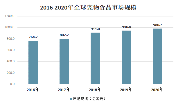 在過去的幾年中,全球寵物食品市場平穩持續增長,主要受益于南非等一些新興的市場發展迅速,2020年全球寵物食品市場規模為980.7億美元,較2019年的946.8億美元同比增長3.6%。全球寵物食品市場基本被瑪氏、雀巢等幾家大企業所壟斷。