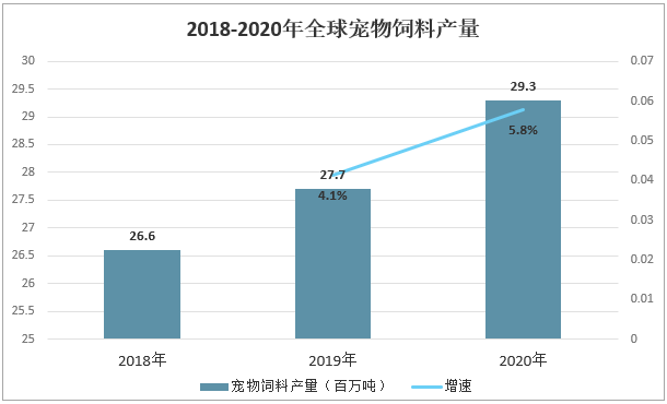 全球寵物市場已逐步成熟,寵物食品作為寵物行業的一個重要分支,是寵物市場最大的“蛋糕”,全球寵物食品市場占整個寵物行業的比重逐年增加。2020年全球寵物飼料產量為29.3百萬噸,較2019年的27.7百萬噸同比增長5.8%。