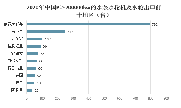 據中國海關數據2020年中國P>200000kw的水泵水輪機及水輪出口數量最多地區為俄羅斯聯邦792臺;其次是出口至烏克蘭地區P>200000kw的水泵水輪機及水輪數量247臺。