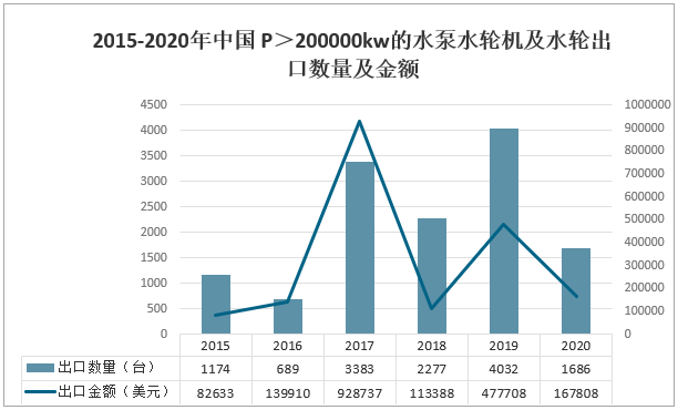 2015-2020年中國 P>200000kw的水泵水輪機及水輪出口數量及金額