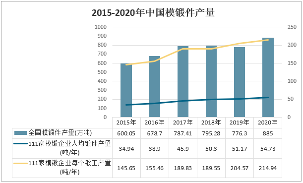 中國模鍛件產量整體呈增加的趨勢,產量由2015年的600.05萬噸增加至2020年的885萬噸,根據中國鍛壓協會對111家模鍛企業統計:2020年總產量為209.23萬噸,人均鍛件產量為54.73噸/年,每個鍛工產量為214.94噸/年。