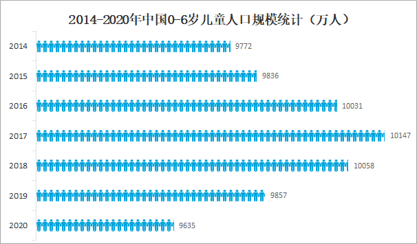 隨著中國人口出生率的下滑,中國0-6歲兒童人口規模也逐年減少,2020年中國0-6歲兒童人口規模為9635萬人,較2019年減少了222萬人,同比減少2.3%。