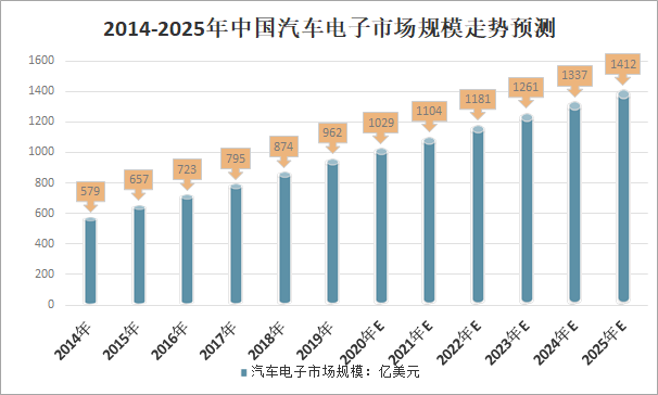 隨著汽車智能化與電動化趨勢不斷發展,汽車電子廣泛應用于汽車各個領域,汽車電子市場快速成長。2014-2019年期間,中國汽車電子市場在持續增長,2019年達到約962億美元,同比增長10.07%;2020年汽車電子市場規模增大約為1029億美元;預計2021年中國汽車電子市場規模將達到1104億美元;2025年中國汽車電子市場規模將達到1412億美元。