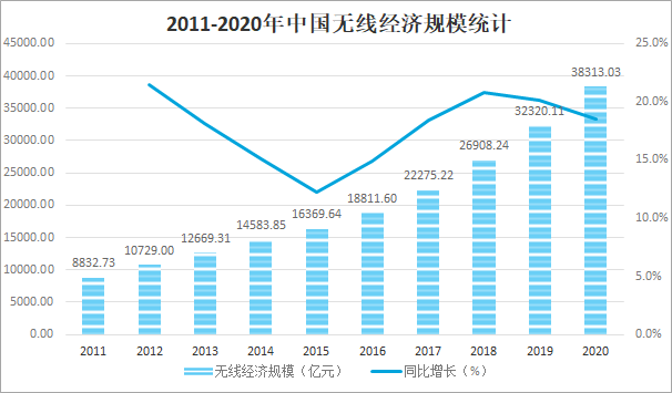 近年來無線技術應用的日趨廣泛,無線經濟將保持較快發展,成為我國經濟高質量發展的重要抓手之一,2020年中國無線經濟增速為18.54%,顯著高于同期GDP增速。