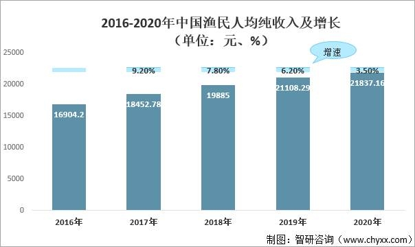 2016-2020年中國漁民人均純收入及增長(單位:元、%)