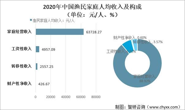在漁民家庭的全部收入中,經營收入是總收入的主要來源,占比近九成。2020年中國漁民家庭總收入71669.28元/人,其中:家庭經營收入63728.27元/人,占88.92%;工資性收入4957.09,占6.92%;財產性凈收入426.67,占0.60%;轉移性收入2557.25,占3.57%。可以看出經營漁業收入仍是漁民家庭收入的主要來源,漁民還是在依靠傳統的生產方式獲得收入,非漁業經營收入渠道有待進一步挖掘和拓展。
