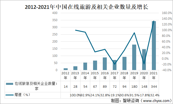隨著我國旅游行業消費不斷升級,旅游消費代理模式逐步被線上平臺模式取代,在線旅游占領了更為廣闊的市場空間。2021年,隨著旅游市場復蘇,在線旅游勢頭向好,在線旅游及相關企業數量增加,2021年,中國在線旅游及相關企業數量344家,較2020年增長196家。2012-2021年中國在線旅游及相關企業數量及增長