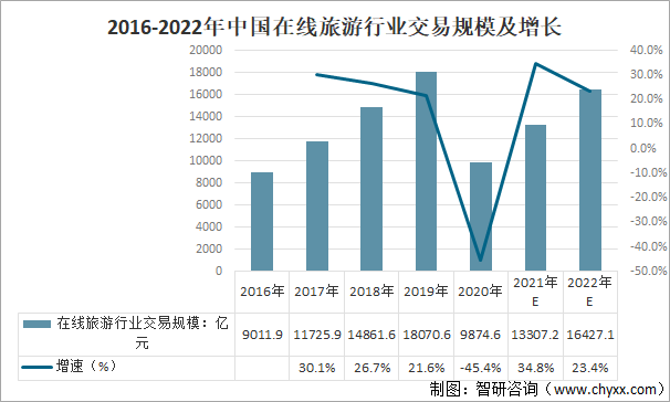 隨著旅游產業收入的快速增長,在線旅游滲透率的不斷提升,我國在線旅游產業市場規模也快速增長。2020年中國在線旅游行業交易規模9874.6億元,同比下降45.4%;2021年中國在線旅游行業交易規模13307.2億元,同比增長34.8%;預計在線旅游行業交易規模16427.1億元,同比增長23.4%。