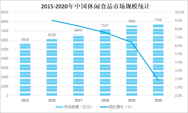 休閑食品能夠滿足人的口欲,消磨閑暇時間,在休息、閑暇時食用的增加生活樂趣的小食品,在分類上屬于快速消費產(chǎn)品。由于其色香味鮮,加上其具有便攜式的特點,深受廣大消費者的喜愛,隨著我國經(jīng)濟發(fā)展和社會進步,休閑食品日益成為大眾青睞食品,2020年中國休閑食品市場規(guī)模達7749億元,較2019年增加了143億元,同比增長1.9%。2015-2020年中國休閑食品市場規(guī)模統(tǒng)計