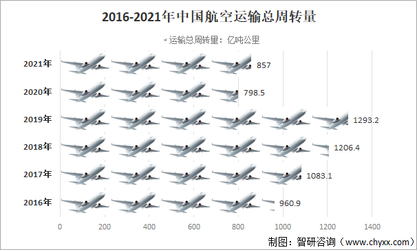 2016-2021年中國航空運輸總周轉量