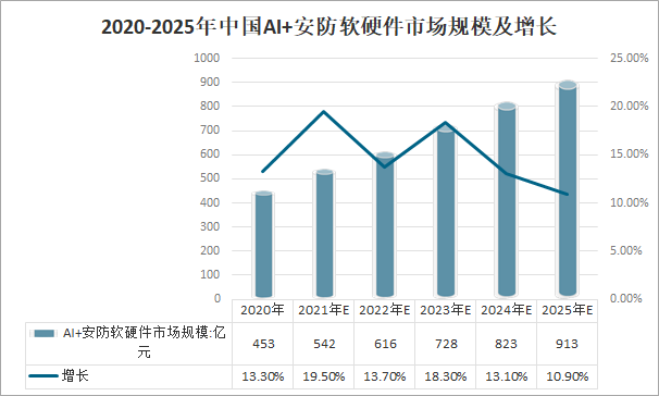 2020-2025年中國AI+安防軟硬件市場規模及增長
