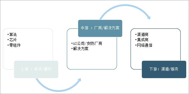 AI+安防上游是包括算法、芯片、及零組件和技術/硬件;中游是AI公司/安防廠商/解決方案;下游是由渠道商、集成商網絡通信等渠道/服務。在人工智能安防行業細分化的應用下,目前已經落地的智能安防技術應用場景有:智慧園區、智能樓宇、智慧交通、智慧煤礦、智慧幼兒園、智慧工地、AI+危化行業、智慧物流、電梯內電瓶車智能檢測等。