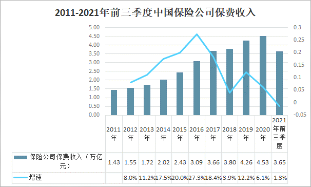 自2000年以來,在中國經濟高速增長,國民收入不斷提高,居民保險消費穩步增長的背景下,我國保險行業迅速成長。盡管中國保險市場規模增長迅速,但與發達國家市場相比仍處于發展初級階段,保險深度和保險密度還處于較低水平,未來發展空間巨大。根據銀監會數據:2021年前三季度中國保險保費收入為3.65萬億元,同比下降1.3%。