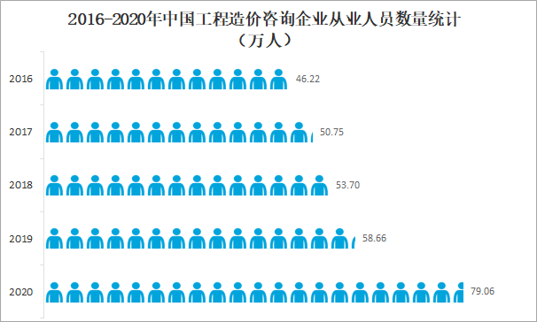 隨著中國(guó)工程造價(jià)咨詢行業(yè)企業(yè)數(shù)量的增加,從業(yè)人員數(shù)量也隨之增加,2020年中國(guó)工程造價(jià)咨詢企業(yè)從業(yè)人員數(shù)量達(dá)79.06萬(wàn)人,較2019年增加了20.40萬(wàn)人,同比增長(zhǎng)34.8%。