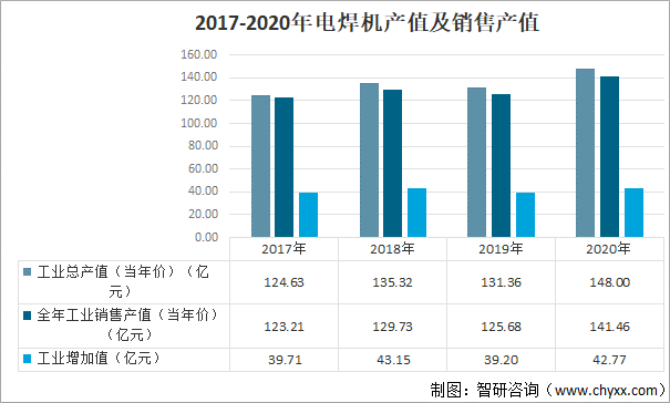 電焊機一般按輸出電源種類可分為兩種,一種是交流電源、一種是直流電。他們利用電感的原理,電感量在接通和斷開時會產生巨大的電壓變化,利用正負兩極在瞬間短路時產生的高壓電弧來熔化電焊條上的焊料,來使它們達到原子結合的目的。根據中國電器工業協會電焊機分會對61家重點企業統計:2020年電焊機工業總產值為148.0億元,同比增長12.7%;工業銷售產值為141.46億元,同比增長12.6%;工業增加值為42.77億元,同比增長9.1%。2017-2020年電焊機產值及銷售產值
