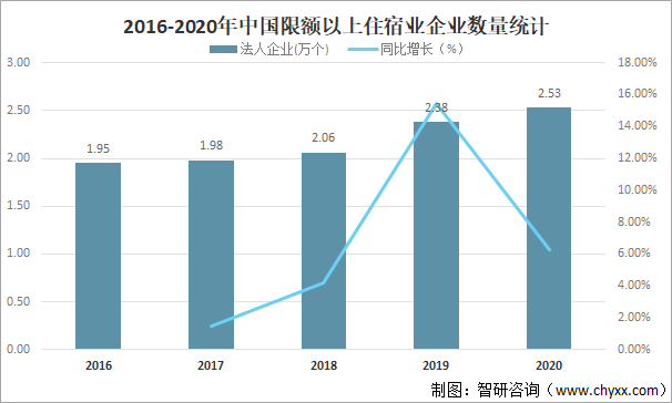 住宿作為旅游行業(yè)三大支柱之一,在供給旅游服務,刺激旅游消費方面發(fā)揮著不可替代的作用,2020年中國限額以上住宿業(yè)企業(yè)數(shù)量達2.53萬個,較2019年增加了0.15萬個,同比增長6.25%。