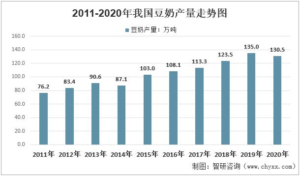 2011-2020年我國豆奶產量走勢圖