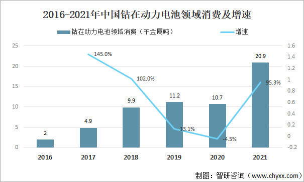 由于新能源汽車需求增加,動力電池需求也增加,鈷在動力電池領域消費也逐年增加,2021年中國鈷在動力電池領域消費20.9千金屬噸,同比增長95.3%。