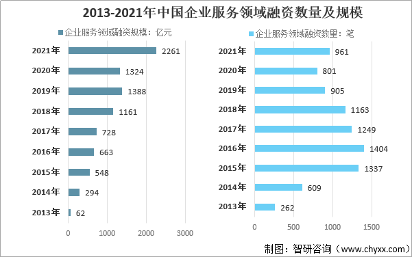 2013-2021年中國企業服務領域融資數量及規模