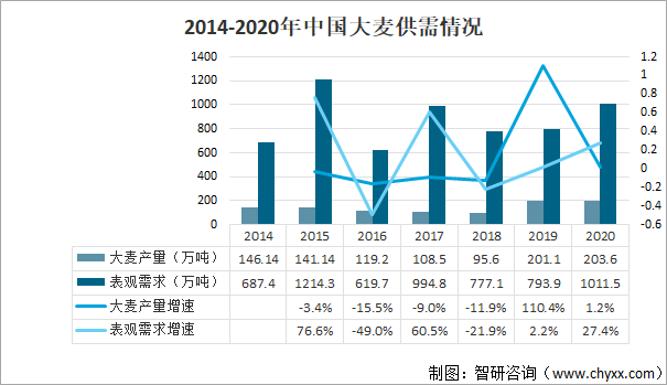 2014-2020中國大麥供需情況