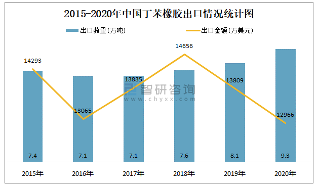 2015-2020年中國丁苯橡膠出口情況統計圖