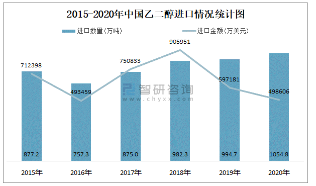 近一年中國乙二醇進出口數量、金額統計表