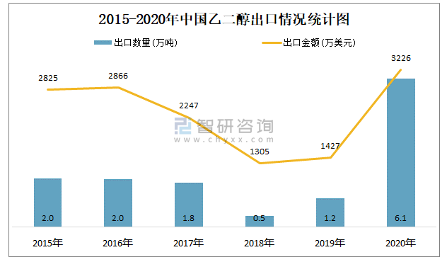 根據中國海關數據顯示:2015-2020年中國乙二醇進口數量總體呈上升趨勢,進口金額在2018年達到最大值;出口數量與出口金額總體均呈上升趨勢。