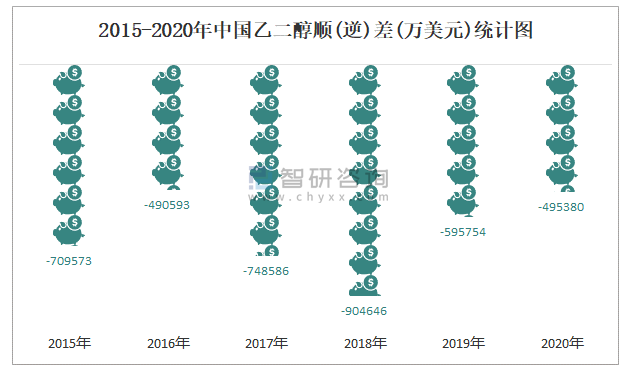2015-2020年中國乙二醇順(逆)差(萬美元)統計圖