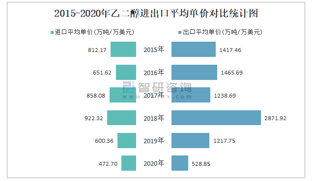 2015-2020年乙二醇進出口平均單價對比統計圖