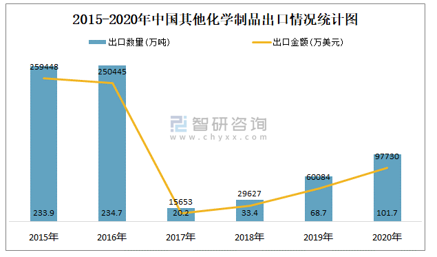 2015-2020年中國其他化學制品出口情況統(tǒng)計圖