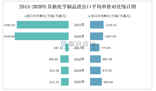 2015-2020年其他化學制品進出口平均單價對比統(tǒng)計圖