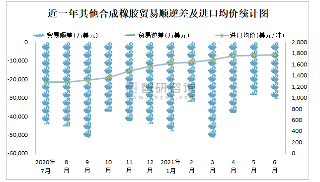 近一年其他合成橡膠貿(mào)易順逆差及出口均價(jià)統(tǒng)計(jì)圖