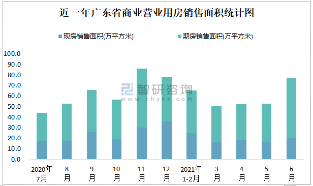 根據國家統計局數據可知:2021年6月廣東省商業營業用房銷售面積為76.68萬平方米(其中銷售現房20.07萬平方米,期房56.61萬平方米);2021年1-6月廣東省商業營業用房累計銷售面積為297.21萬平方米;近一年廣東省商業營業用房期房銷售面積遠高于現房銷售面積。