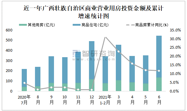 根據國家統計局數據統計可知:2021年6月廣西壯族自治區房地產開發投資商品房投資金額為545.3億元,其中包括辦公樓、商業營業用房等其他用房136.07億元(注:辦公樓、商業營業用房未分開統計);2021年1-6月廣西壯族自治區房地產開發投資包括商業營業用房在內的其他用房累計金額為482.3億元。