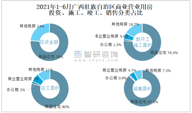 根據國家統計局數據統計可知:2021年1-6月廣西壯族自治區房地產開發企業在包括商業營業用房在內的其他用房投資金額占比為23.6%(注:只有投資金額中其他用房包含辦公樓、商業營業用房),商業營業用房的新開工面積與竣工面積所占比重差異不大,從銷售面積來看,商業營業用房銷售面積占比高于辦公樓銷售面積占比。