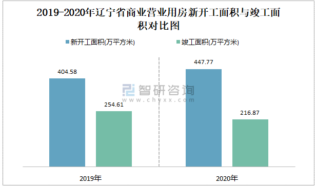 2019-2020年遼寧省商業(yè)營(yíng)業(yè)用房新開(kāi)工面積與竣工面積對(duì)比圖