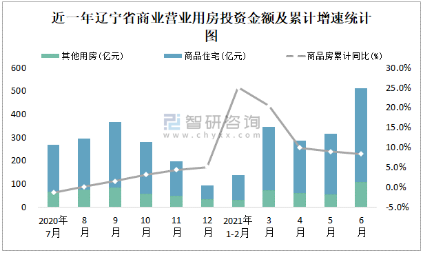 近一年遼寧省商業(yè)營(yíng)業(yè)用房投資金額及累計(jì)增速統(tǒng)計(jì)圖