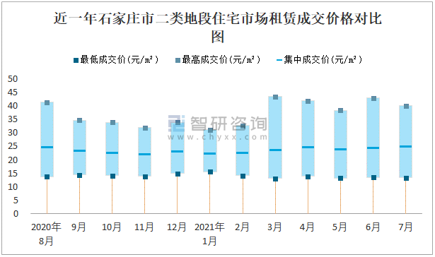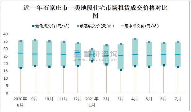 根據(jù)國(guó)信房地產(chǎn)信息網(wǎng)數(shù)據(jù)可知:近一年石家莊市一類(lèi)地段住宅市場(chǎng)租賃成交價(jià)格有一定幅度波動(dòng),7月最高成交價(jià)與最低成交價(jià)差距為16.74元/m²;近一年石家莊市二類(lèi)地段住宅市場(chǎng)租賃最低成交價(jià)與最高成交價(jià)的差距在15.57元/m²-30.31元/m²之間波動(dòng),今年3月差距達(dá)到最大;近一年三類(lèi)地段住宅市場(chǎng)租賃成交價(jià)格在11.7元/m²-30.66元/m²之間波動(dòng),7月集中成交價(jià)為19.31元/m²。