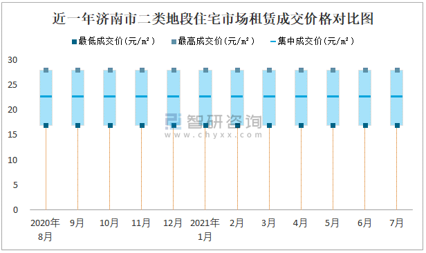 根據國信房地產信息網數據可知:近一年濟南市一類地段住宅市場租賃成交價格有一定幅度波動,7月最高成交價與最低成交價差距為28.83元/m²;近一年濟南市二類地段住宅市場租賃最低成交價與最高成交價的差距較穩定,在11.02元/m²-11.05元/m²之間波動,2020年8月差距達到最大;近一年三類地段住宅市場租賃成交價格在5.85元/m²-15.96元/m²之間波動,7月集中成交價為10.88元/m²。