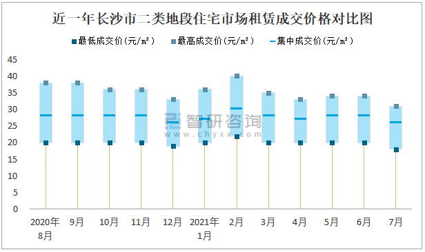 根據國信房地產信息網數據可知:近一年長沙市一類地段住宅市場租賃成交價格有一定幅度波動,7月最高成交價與最低成交價差距為7元/m²;近一年長沙市二類地段住宅市場租賃最低成交價與最高成交價的差距在13元/m²-18元/m²之間波動,2020年8月差距達到最大;近一年三類地段住宅市場租賃成交價格在12元/m²-22元/m²之間波動,7月集中成交價為17元/m²。
