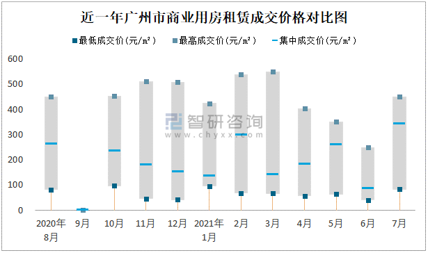 根據(jù)國信房地產(chǎn)信息網(wǎng)數(shù)據(jù)可知:近一年廣州市商業(yè)用房租賃集中成交價(jià)在84.21元/m²-340.26元/m²之間波動,7月集中成交價(jià)為340.26元/m²;寫字樓租賃集中成交價(jià)2020年8月達(dá)到最高值(126.05元/m²)。