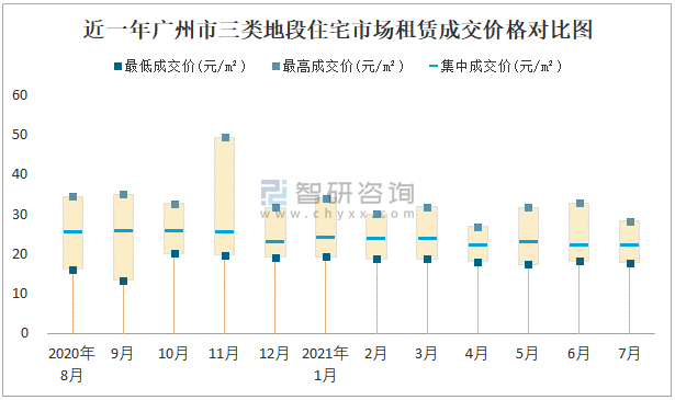 根據(jù)國信房地產(chǎn)信息網(wǎng)數(shù)據(jù)可知:近一年廣州市一類地段住宅市場租賃成交價(jià)格有一定幅度波動,7月最高成交價(jià)與最低成交價(jià)差距為96.5元/m²;近一年廣州市二類地段住宅市場租賃最低成交價(jià)與最高成交價(jià)的差距在38.17元/m²-51.16元/m²之間波動,2020年10月差距達(dá)到最大;近一年三類地段住宅市場租賃成交價(jià)格在13.33元/m²-49.4元/m²之間波動,7月集中成交價(jià)為22.01元/m²。