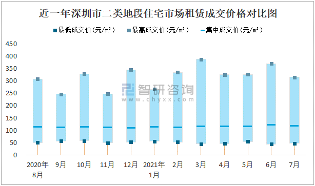 根據國信房地產信息網數據可知:近一年深圳市一類地段住宅市場租賃成交價格有一定幅度波動,7月最高成交價與最低成交價差距為209.5元/m²;近一年深圳市二類地段住宅市場租賃最低成交價與最高成交價的差距在189.3元/m²-341.41元/m²之間波動,今年3月差距達到最大;近一年三類地段住宅市場租賃成交價格在19.34元/m²-329.5元/m²之間波動,7月集中成交價為58.01元/m²。
