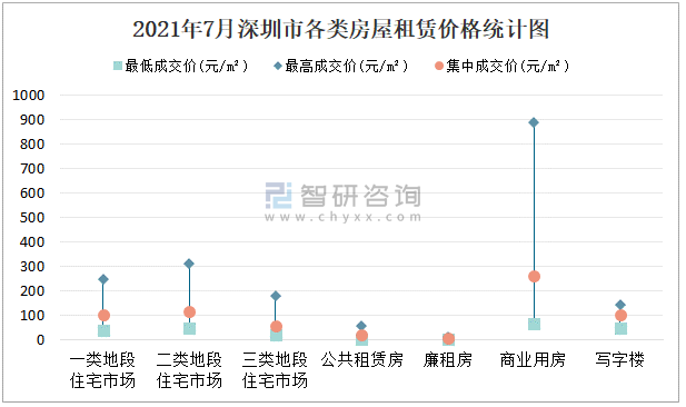 根據國信房地產信息網數據可知:2021年7月深圳市7類房屋中,公共租賃房租賃集中成交價為23.62元/m²,廉租房租賃集中成交價為7.45元/m²;商業用房租賃最低成交價、最高成交價、集中成交價均高于其他類房屋價格;三類地段住宅市場租賃集中成交價約為58.01元/m²。