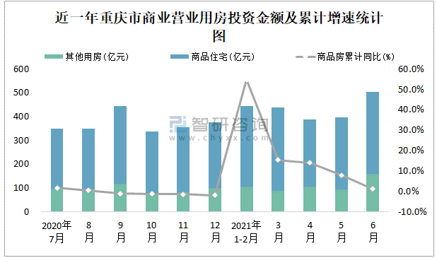 根據國家統計局數據統計可知:2021年6月重慶市房地產開發投資商品房投資金額為503.14億元,其中包括辦公樓、商業營業用房等其他用房158.56億元(注:辦公樓、商業營業用房未分開統計);2021年1-6月重慶市房地產開發投資包括商業營業用房在內的其他用房累計金額為549.44億元。