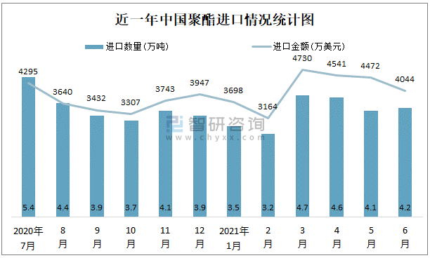 根據(jù)中國石油和化學(xué)工業(yè)聯(lián)合會(huì)數(shù)據(jù)顯示:2021年6月中國聚酯進(jìn)口數(shù)量為4.2萬噸,進(jìn)口金額為4044萬美元;2021年6月聚酯出口數(shù)量為29.5萬噸,出口金額為27714萬美元;近一年中國聚酯出口總金額大于進(jìn)口總金額,貿(mào)易順差為主,6月出口均價(jià)939.5美元/噸。