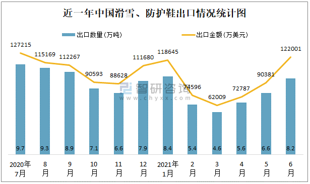 近一年中國滑雪、防護(hù)鞋出口情況統(tǒng)計(jì)圖