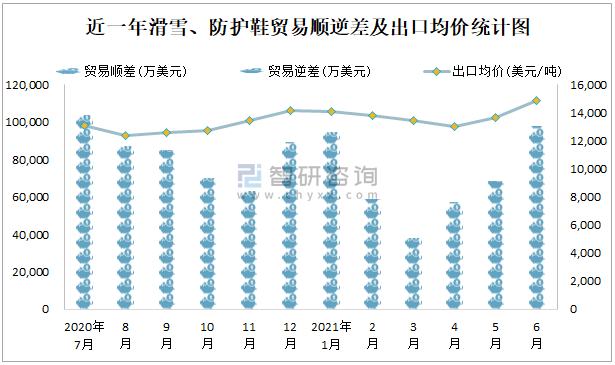 近一年滑雪、防護(hù)鞋貿(mào)易順逆差及出口均價統(tǒng)計(jì)圖
