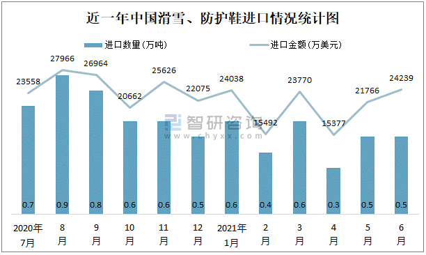 根據(jù)中國石油和化學(xué)工業(yè)聯(lián)合會數(shù)據(jù)顯示:2021年6月中國滑雪、防護(hù)鞋進(jìn)口數(shù)量為0.5萬噸,進(jìn)口金額為24239萬美元;2021年6月滑雪、防護(hù)鞋出口數(shù)量為8.2萬噸,出口金額為122001萬美元;近一年中國滑雪、防護(hù)鞋出口總金額大于進(jìn)口總金額,貿(mào)易順差為主,6月出口均價14878.2美元/噸。