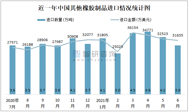 近一年中國其他橡膠制品進出口數量、金額統計表
